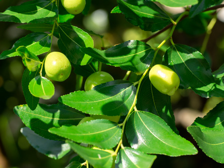 Green unripe jujube fruit on a jujube fruit tree in the garden. selective focus with blurred background.