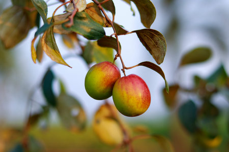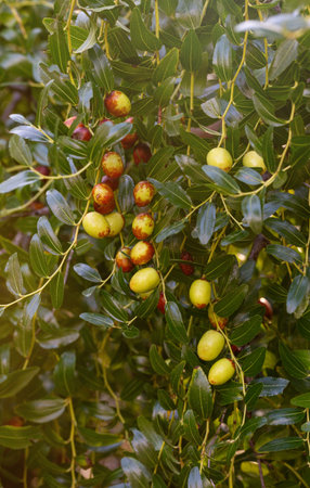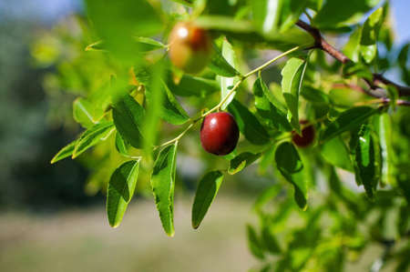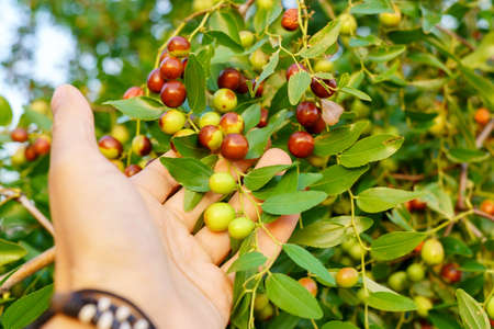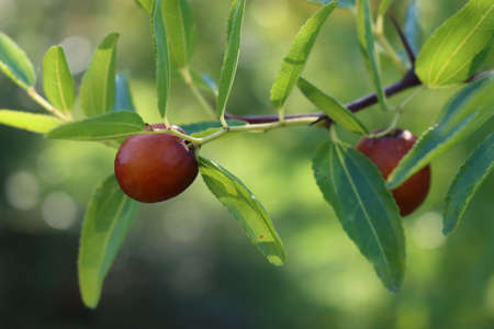 Ripe and green Jujube fruits on branch at orchard near Dallas, Texas, America. Chinese date, genus Ziziphus in the buckthorn family Rhamnaceae