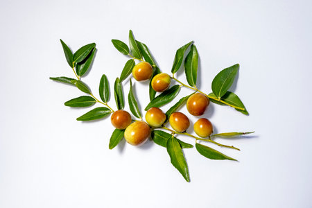 A branch with ripening jujube fruit or chinese dates, isolated over green backhround with copy advertising space. Antioxidant healthy raw vegan food. Creative Jujube fruit patterns.