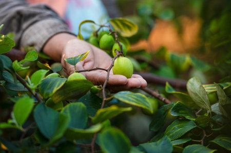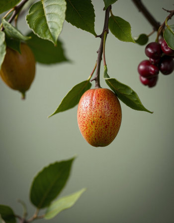 Green Giuggiola branch adorned with ripe fruits, surrounded by lush leaves, basking in sunlight, creating a tranquil and inviting outdoor scene filled with natures beauty