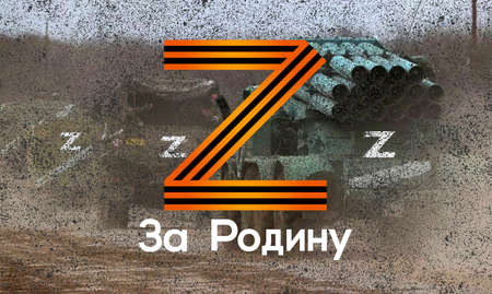 Russia with Z Russian military symbol with text in Russian. Russian Armed Forces Z mark. Translation For the Motherland