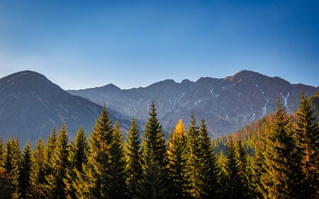Old coniferous forest illuminated by winter sun. Selective focus on green fir trees, blurred background with the mountain pattern. Tatra National Park, Poland.