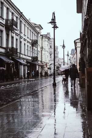 Vilnius, Lithuania - February 25, 2020: Stormy rainy steet on a weekday afternoon
