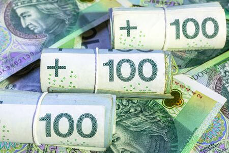 Financial background with many polish zloty banknotes 100 200 zl pln. Finance concept