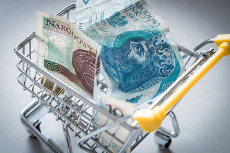 A shopping cart filled with money from Poland. The concept of rising prices in stores and rising inflation