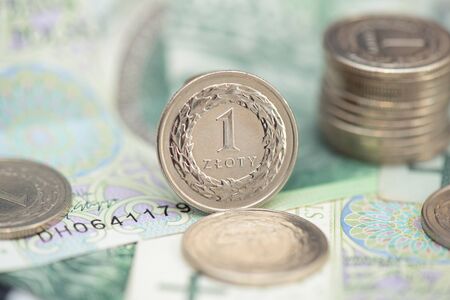 one zloty coin on the background of banknotes - Polish currency