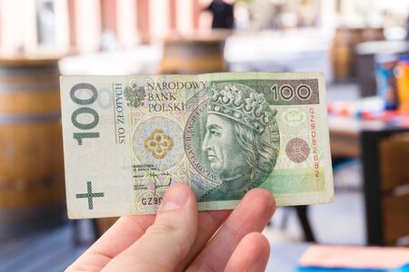 Man holding 100 Polish zloty bill in outdoor restaurant terrace. Tourist showing an one hundred banknote.