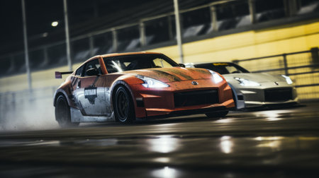 two nissan 370z from 1990 engaged in intense racing, with drivers exchanging glances. sparks flying beneath the cars on a slightly wet track, capturing reflections. a cinematic shot on grainy medium format kodak portra 800 film using smc takumar 105mm f/2.8 lens, creating a dynamic and nostalgic atmosphere. ai generated