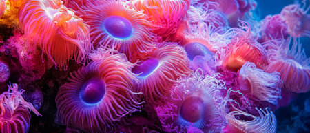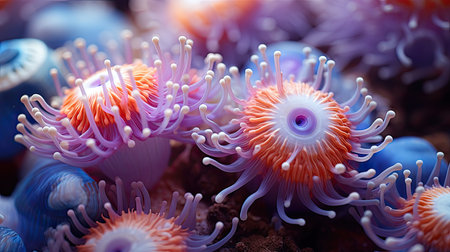 Wonderful aquatic life in ocean seabed. anemones. Coral reef design. Generative AI. Illustration for banner, poster, cover, brochure or presentation.