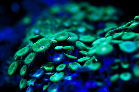 Vivid tropical blue zoanthids coral polyps thriving in a reef tank aquarium