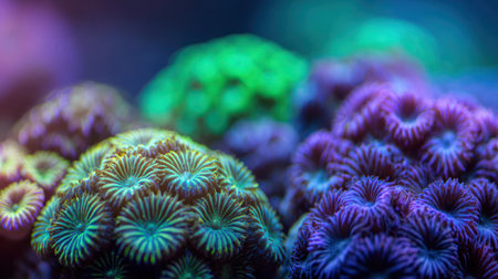 This image showcases a vibrant collection of coral formations, displaying a spectrum of vivid colors including green, purple, and blue. The macro photography highlights intricate textures and patterns. The overall composition suggests an underwater environment with soft lighting, suitable for various editorial and commercial applications related to marine life and ecosystems.