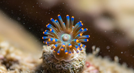A vibrant macro photograph of a nudibranch, a type of sea slug, on the seafloor. This tiny marine invertebrate resembles a flower with distinctive tentacles featuring bright blue and orange tips, showcasing the beauty of underwater biodiversity.
