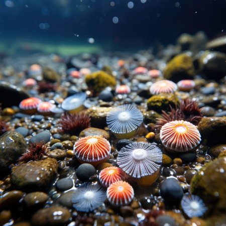 Explore a stunning underwater scene showcasing a vibrant coral reef adorned with colorful sea anemones. This close-up captures the unique beauty of marine life enhanced by a shimmering bokeh effect, creating an enchanting atmosphere.