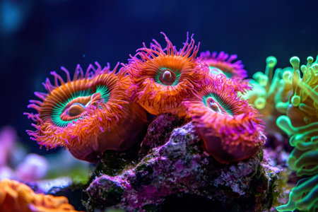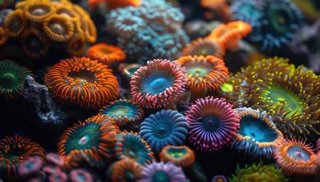 Close-up of colorful zoanthids coral polyps thriving in a vibrant reef aquarium environment