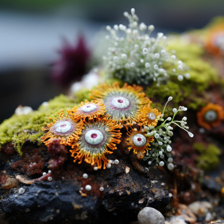 A close-up view of a patch of colorful lichen growing on a rock, a tiny world of symbiosis in bloom, with a microcosm of insects bustling within.
