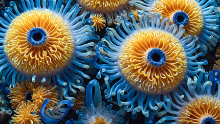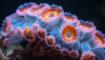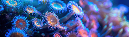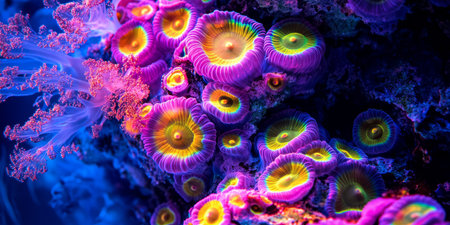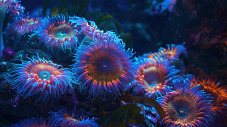 A Vibrant close-up of sea anemones with glowing centers in an underwater aquatic setting.