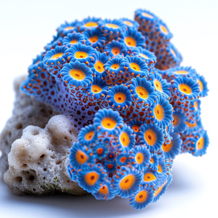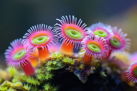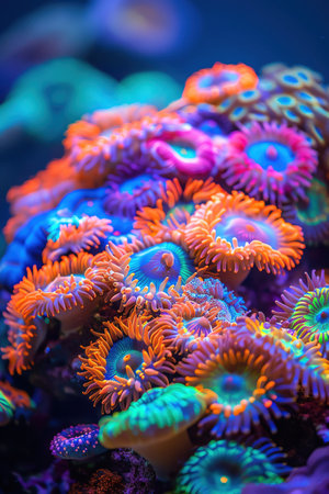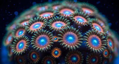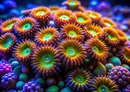 Close-up of colorful zoanthids coral polyps thriving in a vibrant reef aquarium environment