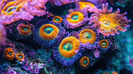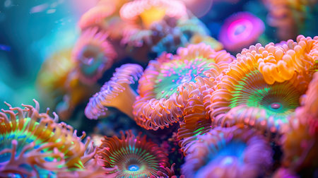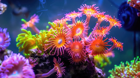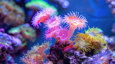 Vibrant underwater coral reef with colorful anemones and vivid marine life, close-up view. Ocean biodiversity and aquatic ecosystem concept