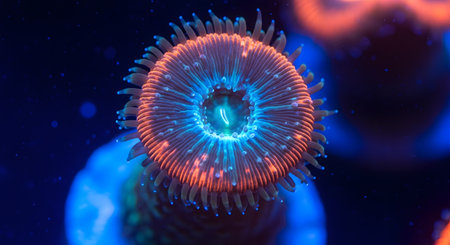 Vivid tropical blue zoanthids coral polyps thriving in a reef tank aquarium