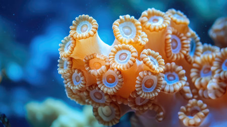 A detailed macro shot of a vibrant fluorescent coral polyp with orange and blue colors. The underwater image captures the intricate texture and beauty of exotic marine life.