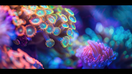 Explore a stunning underwater scene showcasing a vibrant coral reef adorned with colorful sea anemones. This close-up captures the unique beauty of marine life enhanced by a shimmering bokeh effect, creating an enchanting atmosphere.