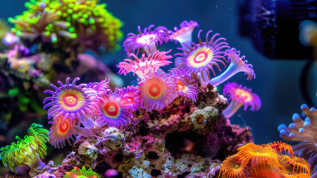 Discover a stunning underwater aquarium scene showcasing vibrant coral and colorful sea anemones, creating a mesmerizing marine habitat filled with life.