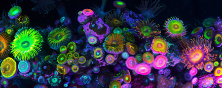 A striking display of fluorescent corals in bright hues such as neon yellow, electric purple, and vibrant green, isolated on a black background to showcase their glowing and intricate designs.