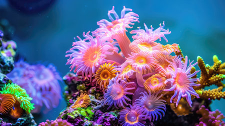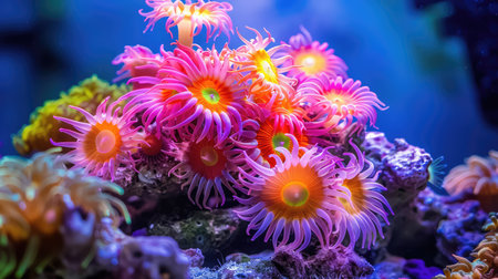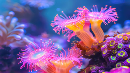 Vibrant underwater coral reef with colorful anemones and vivid marine life, close-up view. Ocean biodiversity and aquatic ecosystem concept