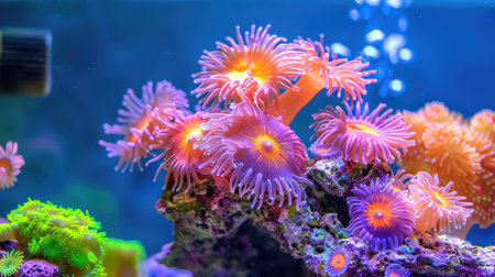 A stunning display of colorful coral and sea anemones in a vibrant underwater ecosystem, showcasing the diversity and beauty of marine life in an aquarium setting.
