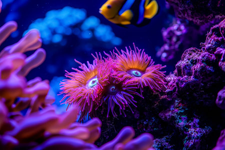 Discover a stunning underwater aquarium scene showcasing vibrant coral and colorful sea anemones, creating a mesmerizing marine habitat filled with life.