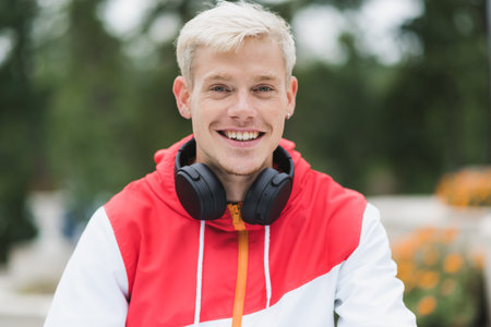 Portrait of attractive blond handsome man with healthy toothy smile, with headphones on neck relaxing in the park of the city. Street fashion style. People, lifestyle and technology concept.