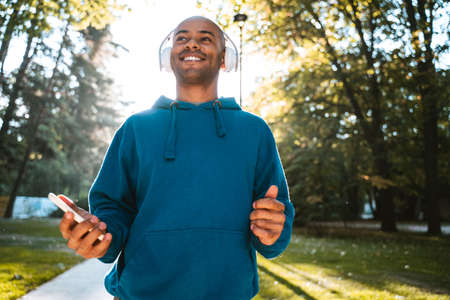 Portrait of young cheerful african-american man in sports clothing who is looking at camera and smiling.