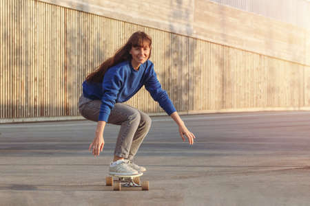 Woman riding a skateboard at urban city. Female skateboarder wears blue sweatshirt.