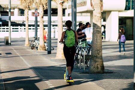 Tel Aviv Israel December 22, 2019 View of unidentified people rolling with a electric scooter in the streets of Tel Aviv in the afternoon