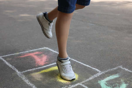 Little child playing hopscotch drawn with chalk on asphalt outdoors, closeup