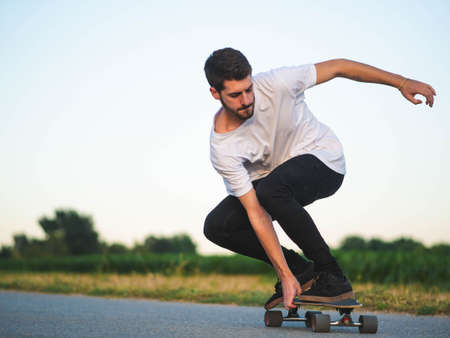 Stylish teenager makes a jump on a longboard tricks on urban city background sunset.