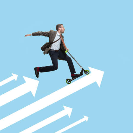 Business concept. Young manager, finance analyst or clerk in office suit isolated on blue background. Collage, illustration