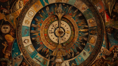 Zodiac signs inside of horoscope circle - astrology and horoscopes concept. Abstract astrological background. Ai generated illustration.