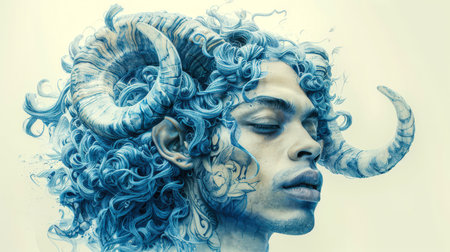 An African man with blue curly hair and horns on his head. The concept of the horoscope sign is Aries or Capricorn. A stylish portrait of a guy with horns. Astrological forecast