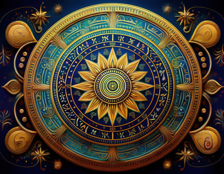 This vibrant and detailed zodiac wheel showcases various astrology symbols surrounding a radiant sun, all set against a dark space background, perfect for astrology enthusiasts.