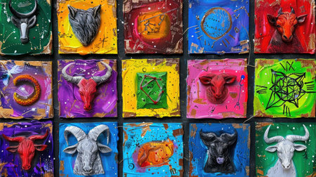 This abstract artwork highlights intricate celestial patterns and symbols in vibrant colors against a dark background, evoking a sense of mystery and spirituality.