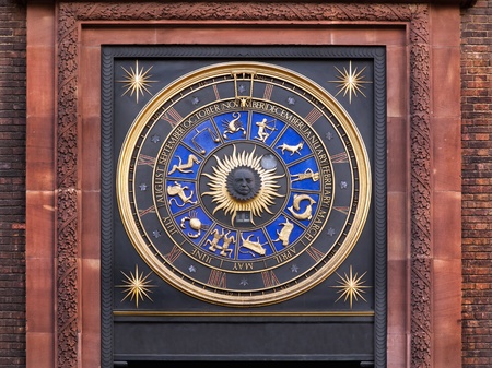 Astronomical clock close up background. Zodiac sign. Double exposure