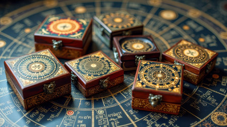 Ornate wooden boxes on astronomical chart with intricate geometric patterns. That the image is generated using AI.