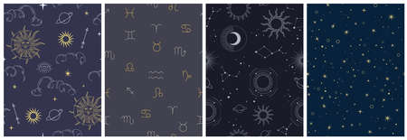 Celestial astrological background with constellations, stars, sun and moon. Mystical astrology, celestial space with golden signs. Vector illustration.