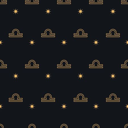 Zodiac seamless gold pattern. Repeating libra sign with stars on a black background. Vector horoscope symbol