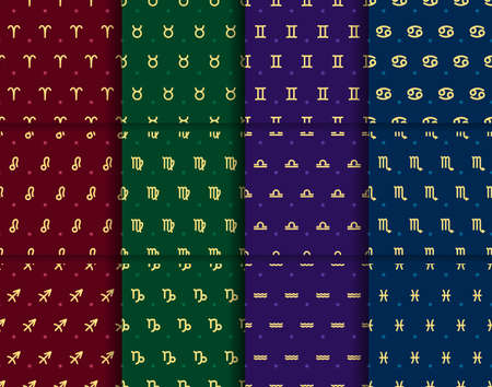 Vector set of gold zodiac signs patterns. Repeated horoscope elements. Astrologycal symbols. Aries, leo, sagittarius. Taurus, virgo. Capricorn, gemini, libra aquarius Cancer scorpio pisces