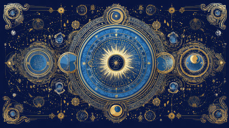Intricately designed zodiac boxes on astrological chart. That the image is generated using AI.