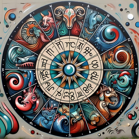 This captivating image features an intricate astrological wheel adorned with golden zodiac signs and celestial symbols set against a dark background.