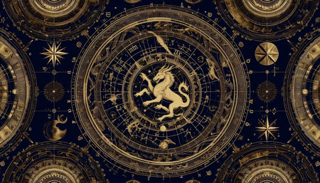 A close-up view presents a detailed astrological wheel design in a gold hue set against a dark backdrop. The composition features a symmetrical arrangement of zodiac symbols and celestial elements. The image displays artistic patterns, suitable for various editorial and commercial applications. The lighting suggests an indoor setting.