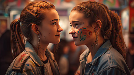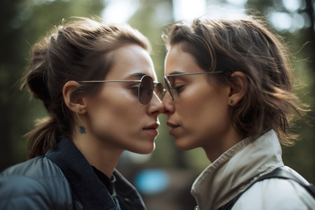 Two young women spending time together, kissing. LGBT, lesbian couple, relationship. Diversity, homosexuality. Partners with non-traditional sexual orientation. Sensual moment. Generative AI.